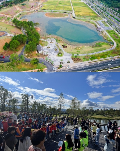 龍州濕地是九龍江流域山水林田湖草沙一體化保護(hù)和修復(fù)項(xiàng)目海綿城市建設(shè)范例工程,也是我市2023年十大重點(diǎn)攻堅(jiān)項(xiàng)目北部新城建設(shè)的“點(diǎn)睛之筆”,主要使用的是國家政策補(bǔ)助資金。項(xiàng)目占地面積約20公頃,通過“護(hù)山、理水、營林、興田、清湖、豐草”六大舉措,構(gòu)建了蓄洪湖區(qū)、生態(tài)修復(fù)區(qū)、農(nóng)田區(qū)及休閑區(qū)多樣用地,同時(shí),設(shè)置了蓄洪湖、濕地步道、山谷攔蓄、引水工程等海綿設(shè)施,實(shí)現(xiàn)“城在田中田在城中”山水田園與城市和諧共生的美好景象。
