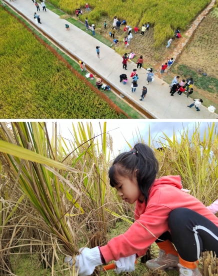 11月12日,市政集團(tuán)建設(shè)的龍州濕地水稻田迎來了豐收季,藍(lán)天白云倒影在清澈見底的湖面,伴隨著五彩繽紛的波斯菊花海搖曳生姿,金黃色的稻谷在秋風(fēng)中散發(fā)著陣陣稻香...城市的繁華與美不勝收的風(fēng)景和諧共生的畫面,吸引了來自龍巖中心城區(qū)中小學(xué)生、家長及眾多市民前來參觀、體驗(yàn)。學(xué)生們利用假期走進(jìn)田間課堂,真切體會了龍巖“新晉網(wǎng)紅打卡地”的獨(dú)特魅力。